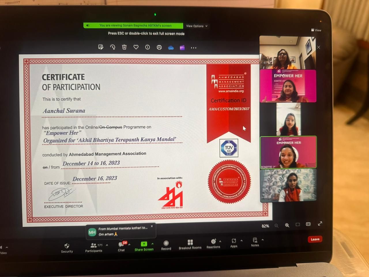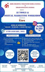 IKTARA Edu in collaboration with Akhil Bhartiya Terapanth Mahila Mandal and Terapanth Kanya Mandal, organized 15 hours (1 hour per day) paid online workshop from 27th January 2025, focused to make the women power more strong and technically strong. The event covered with a range of topics including 10 career boosƟng AI tools and Canva, Content MarkeƟng, Social Media MarkeƟng, SEO and Email MarkeƟng. Mr. Rishabh Patwari commenced the workshop with the power of a new-age that helped to transform career and business. ParƟcipants gained pracƟcal knowledge and skills to improve their professional image and overall well-being, The workshop concluded with the distribution of e-certificates, after submitting the three-assignment provided and attendees with recognition for their participation and learing achievements.