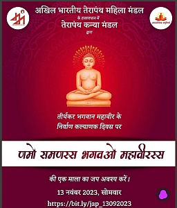 On November 13, 2023, the Terapanth Kanya Mandal, organized a spiritual event commemorating the Nirvana Kalyanak Diwas of Tirthankar Bhagwan Mahavir. The event focused on the recitation of "Namo Samanassa Bhagavato Mahavirassa," with emphasis on spiritual practices. Attendees were encouraged to participate in chanting the mantra for spiritual upliftment and reverence towards Lord Mahavir.